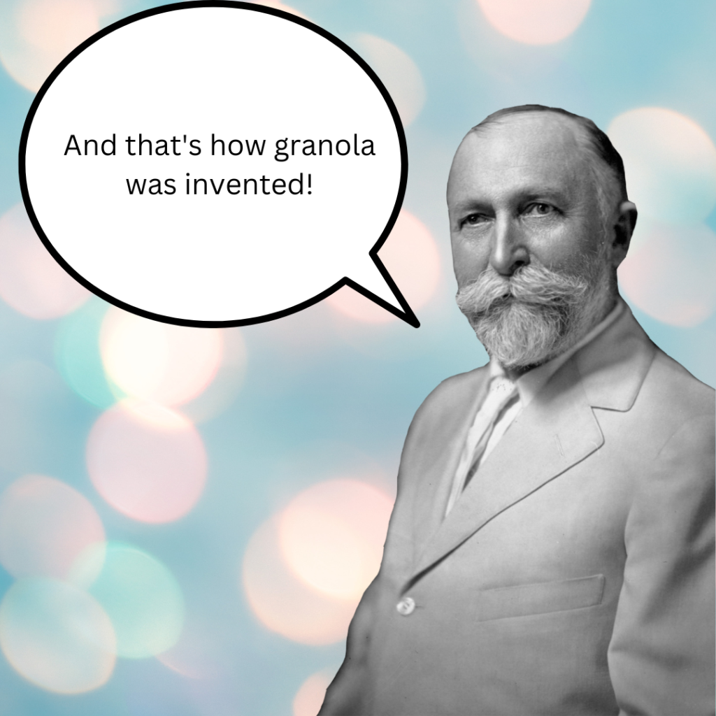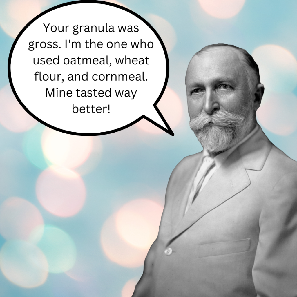 Around the same time, John Harvey Kellogg invented a similar product and also named it “granula.” Kellogg’s granula was made from oatmeal, wheat flour, and cornmeal.