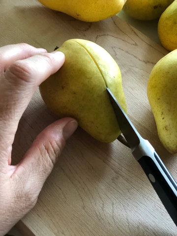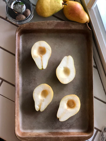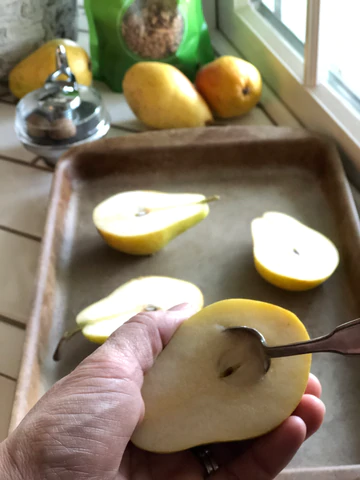- Cut the pears in half lengthwise, and slice off a little of the uncut side so that the pears will lay flat on your baking pan.