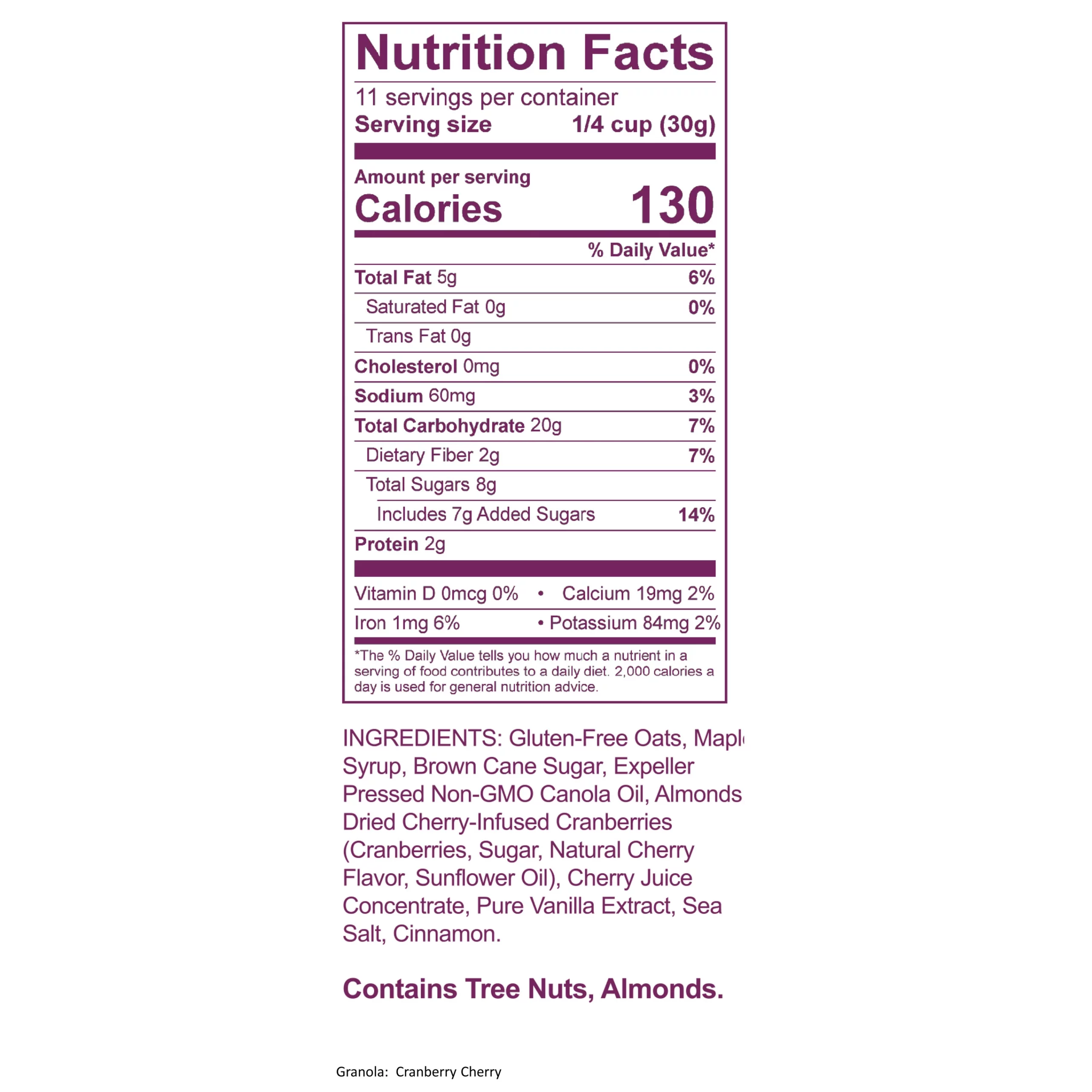 Gluten free rolled oats and slivered almonds, combined with the sweetness that only the combination of cranberries and cherries can bring. We add Michigan maple syrup, pure vanilla, and cinnamon to give this artisan blend a delicious balance of flavors.