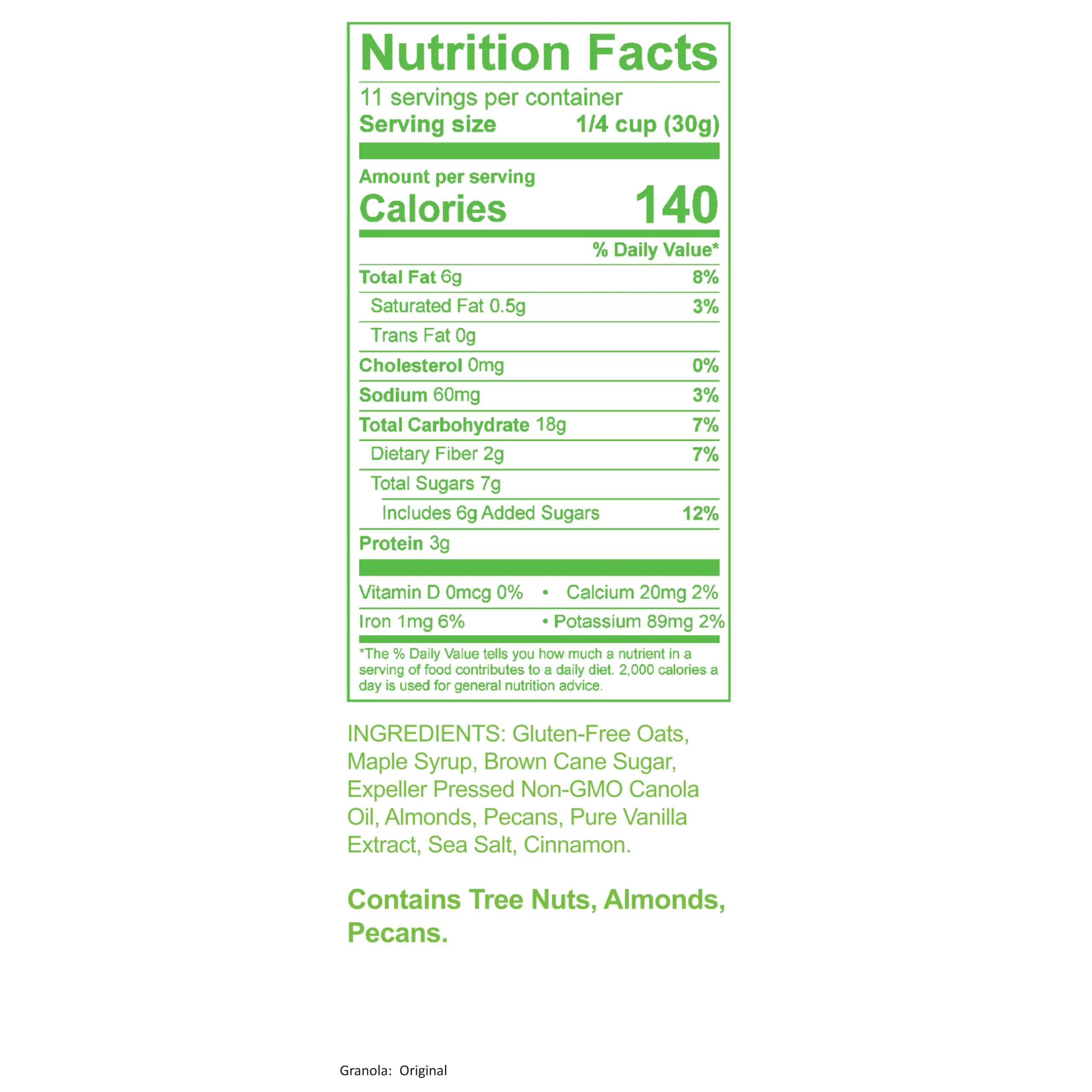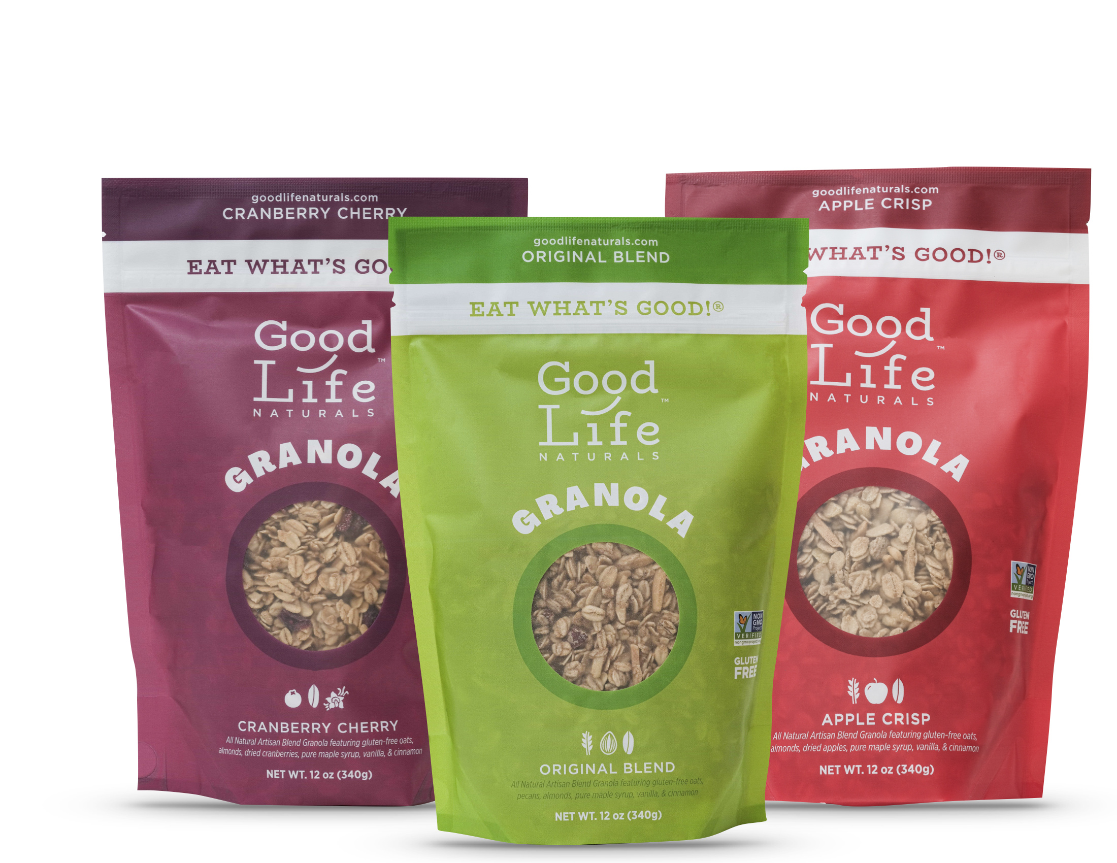 Good Life Naturals' gluten-free Original Blend is made from only the best natural ingredients. Gluten free rolled oats, pecans and almonds, combined with the sweetness of Michigan maple syrup, brown cane sugar, pure vanilla, and cinnamon give our artisan blend granola a deliciously perfect balance of flavors. Put it on yogurt, ice cream, or enjoy it in a cereal bowl with milk. Or, just eat it straight out of the bag. It’s that good.