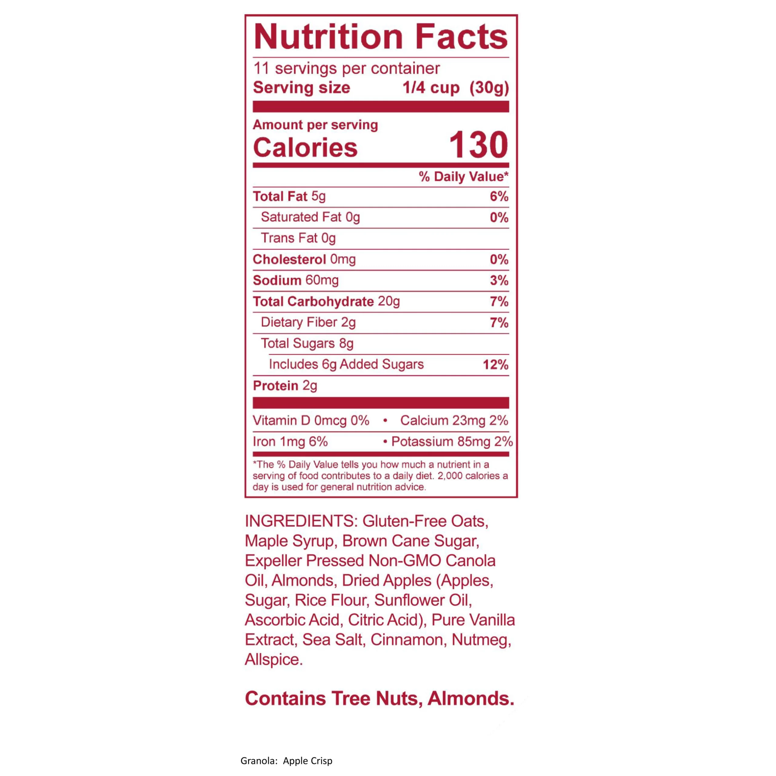 Hearty gluten-free rolled oats, Michigan maple syrup, non-GMO Canola oil, and almonds give our artisan blend granola a deliciously perfect balance of flavors.